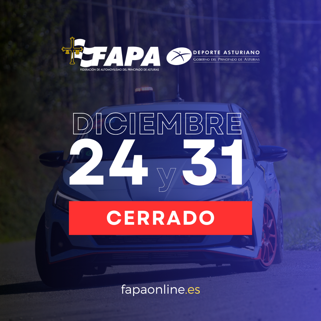 Las oficinas de la Federación de Automovilismo del Principado de Asturias permanecerán cerradas los días 24 y 31 de diciembre.