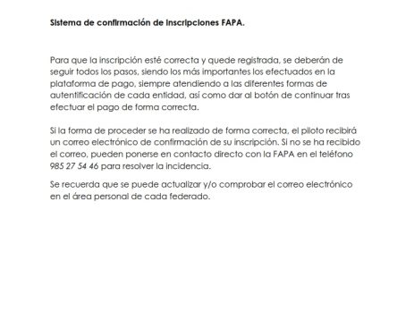 Si la forma de proceder se ha realizado de forma correcta, el piloto recibirá un correo electrónico de confirmación de su inscripción. Si no se ha recibido el correo, pueden ponerse en contacto directo con la FAPA en el teléfono 985 27 54 46 para resolver la incidencia.