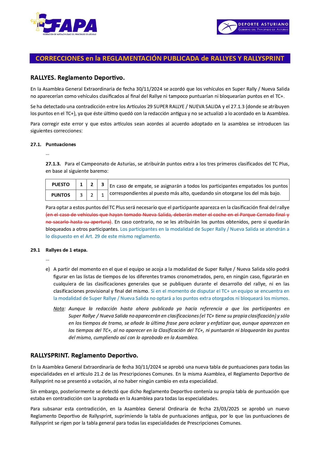 CORRECCIONES en la REGLAMENTACIÓN PUBLICADA de RALLYES Y RALLYSPRINT
