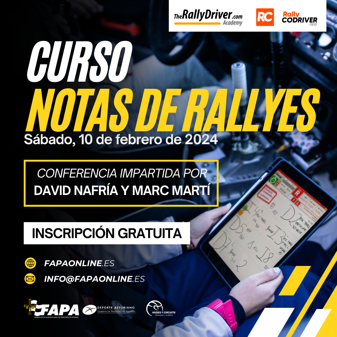 ¿Eres piloto y/o copiloto y quieres aumentar tu conocimiento sobre la toma de notas y todo lo relativo a ello además de incluir el uso de nuevas tecnologías? ¿Eres aficionado y te gustaría conocer el mundo del copilotaje? David Nafría y Marc Martí impartirán el Curso Notas de Rallyes durante la tarde del sábado, 10 de febrero, en el Salón de actos del Museo y Circuito Fernando Alonso. Además, contaremos con dos colaboradores de lujo como son Diego Ruiloba y Ángel Vela.