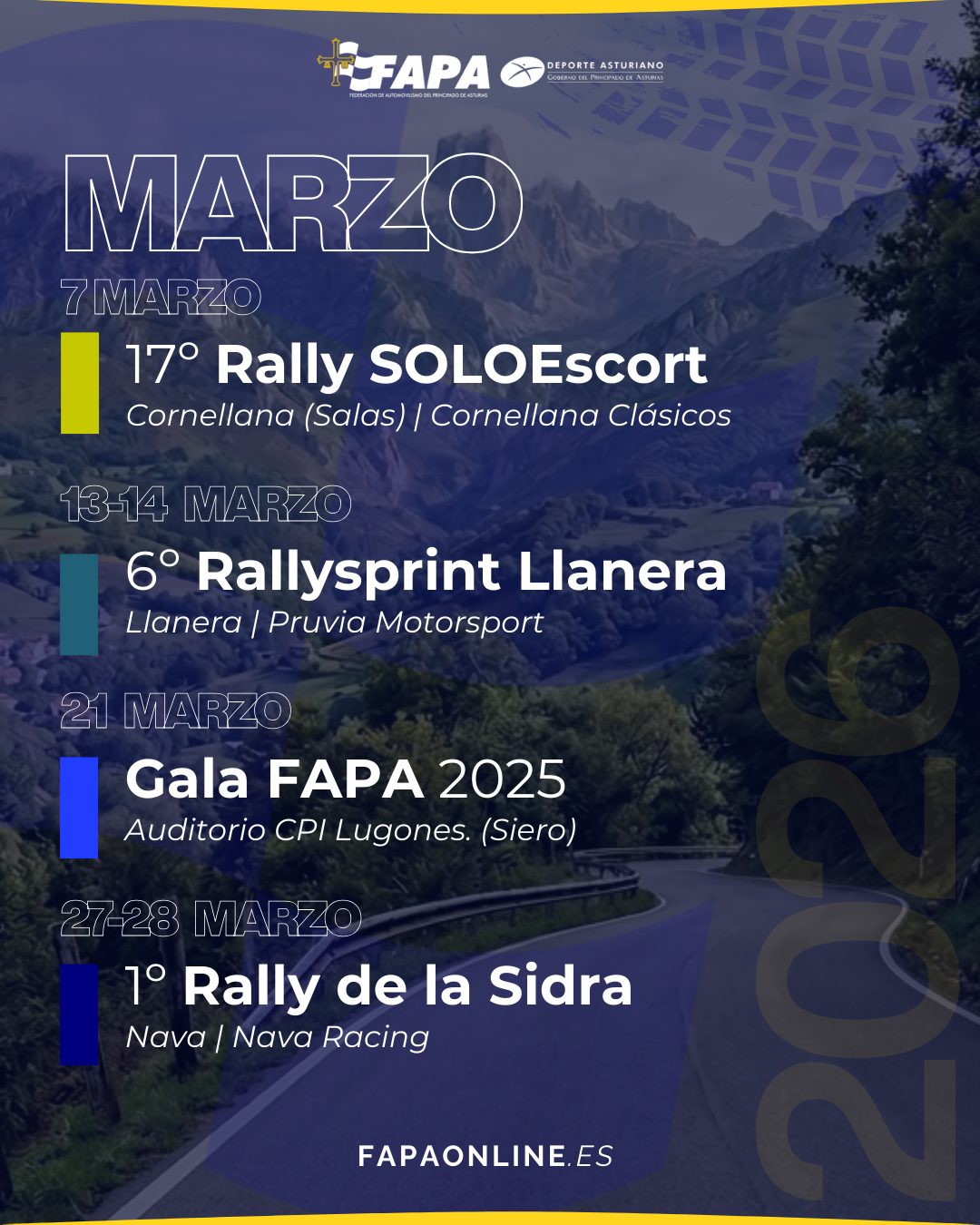 Marzo es el primer mes de acción para este 2026 en Asturias, con cuatro eventos clave repartidos por la geografía asturiana, donde los equipos y aficionados al motor disfrutarán de una programación que combina la competición con la gala anual de la Federación de Automovilismo del Principado de Asturias.