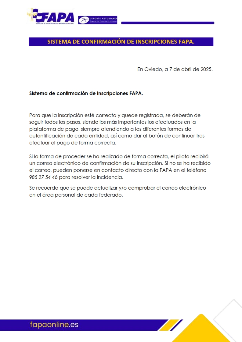 Si la forma de proceder se ha realizado de forma correcta, el piloto recibirá un correo electrónico de confirmación de su inscripción. Si no se ha recibido el correo, pueden ponerse en contacto directo con la FAPA en el teléfono 985 27 54 46 para resolver la incidencia.