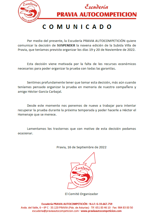 La Escudería PRAVIA AUTOCOMPETICIÓN quiere comunicar la decisión de SUSPENDER la novena edición de la Subida Villa de Pravia, que teníamos previsto organizar los días 19 y 20 de Noviembre de 2022.